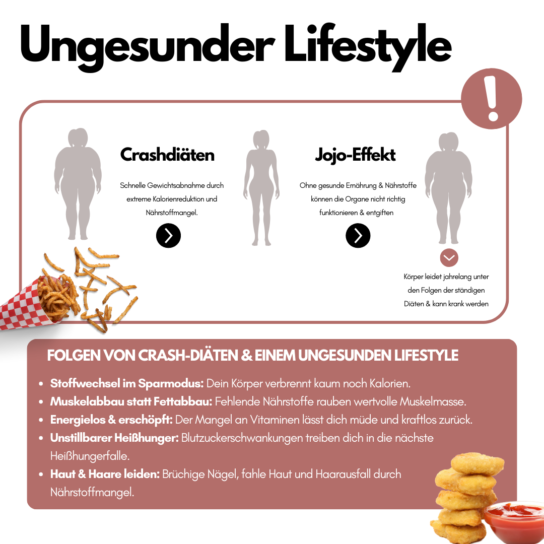 Seit Jahren kämpfst du, um deinen Wohlfühlkörper zu erreichen, doch dein Körper wirkt oft müde und ausgelaugt. Du hast ihn mit Süßstoffen, Light-Produkten, Proteinpulvern und Shakes vollgestopft – alles in der Hoffnung, schneller ans Ziel zu kommen. Dein Fokus lag auf kurzfristigen Tricks statt auf echter Gesundheit. Jetzt merkst du vielleicht, wie dein Stoffwechsel aus dem Gleichgewicht geraten ist und nichts mehr so funktioniert, wie es sollte.
